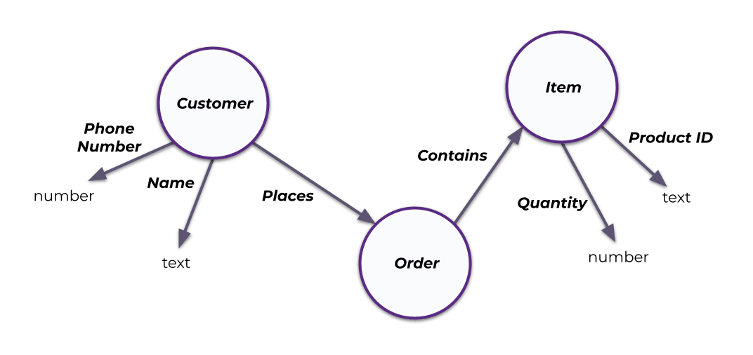 This simple ontology describes the entities involved in a business’s fulfillment operations processes (customers, orders, and items), their attributes (phone numbers, names, quantities, and product IDs), and the relationships between them (a customer places an order, an order contains an item).
