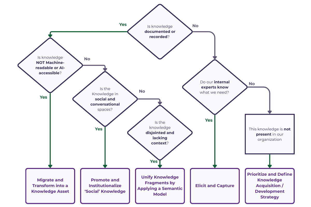 It is important, at this point, to make the distinction between knowledge that is truly missing from the organization and knowledge that is simply unavailable to the organization’s AI solution. The approach to close the knowledge gap will hinge on this key distinction.