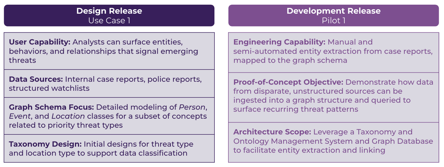 The below image illustrates how design and development releases work together, with a generalized example from EK’s semantic layer implementation strategy with the government agency focused on intelligence analysis.