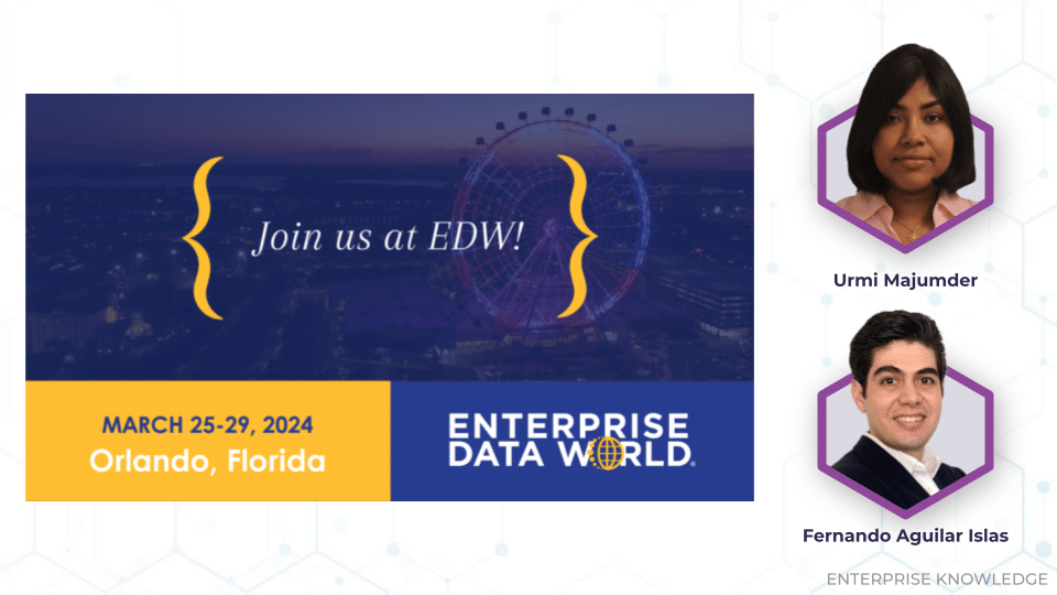 Enterprise Knowledge’s Urmi Majumder, Principal Data Architecture Consultant, and Fernando Aguilar Islas, Data Science Consultant, will be delivering a talk at the Enterprise Data World conference on the topic of “Driving Behavioral Change for Information Management through Data-Driven Green Strategy.”