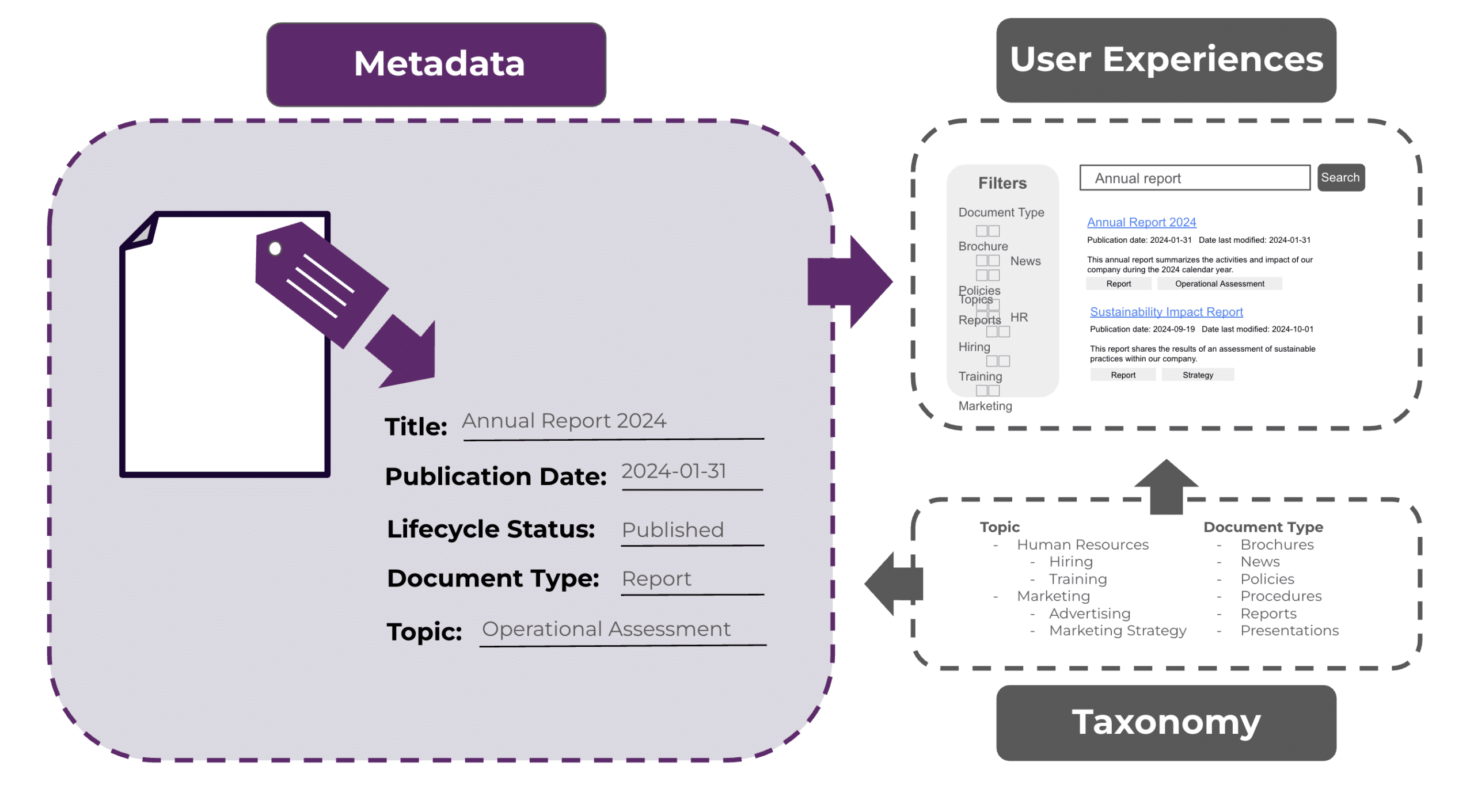 Metadata also enables AI-supported interactions. As an explicit signal of an asset’s characteristics, metadata ensures that AI-powered tools can reference and leverage the asset when appropriate. For instance, a semantic search engine can be tuned to prioritize information in assets marked with specific Document Types, or a content generation tool can be directed to summarize the most recent, published assets on a topic.