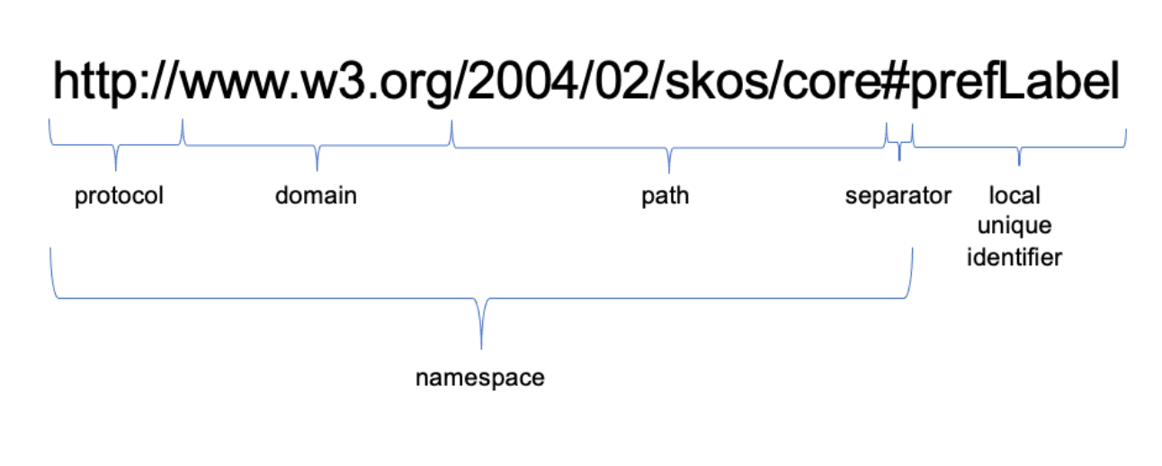 Together, the protocol, domain, path, and separator form a namespace. In the example above, the namespace is http://www.w3.org/2004/02/skos/core#.