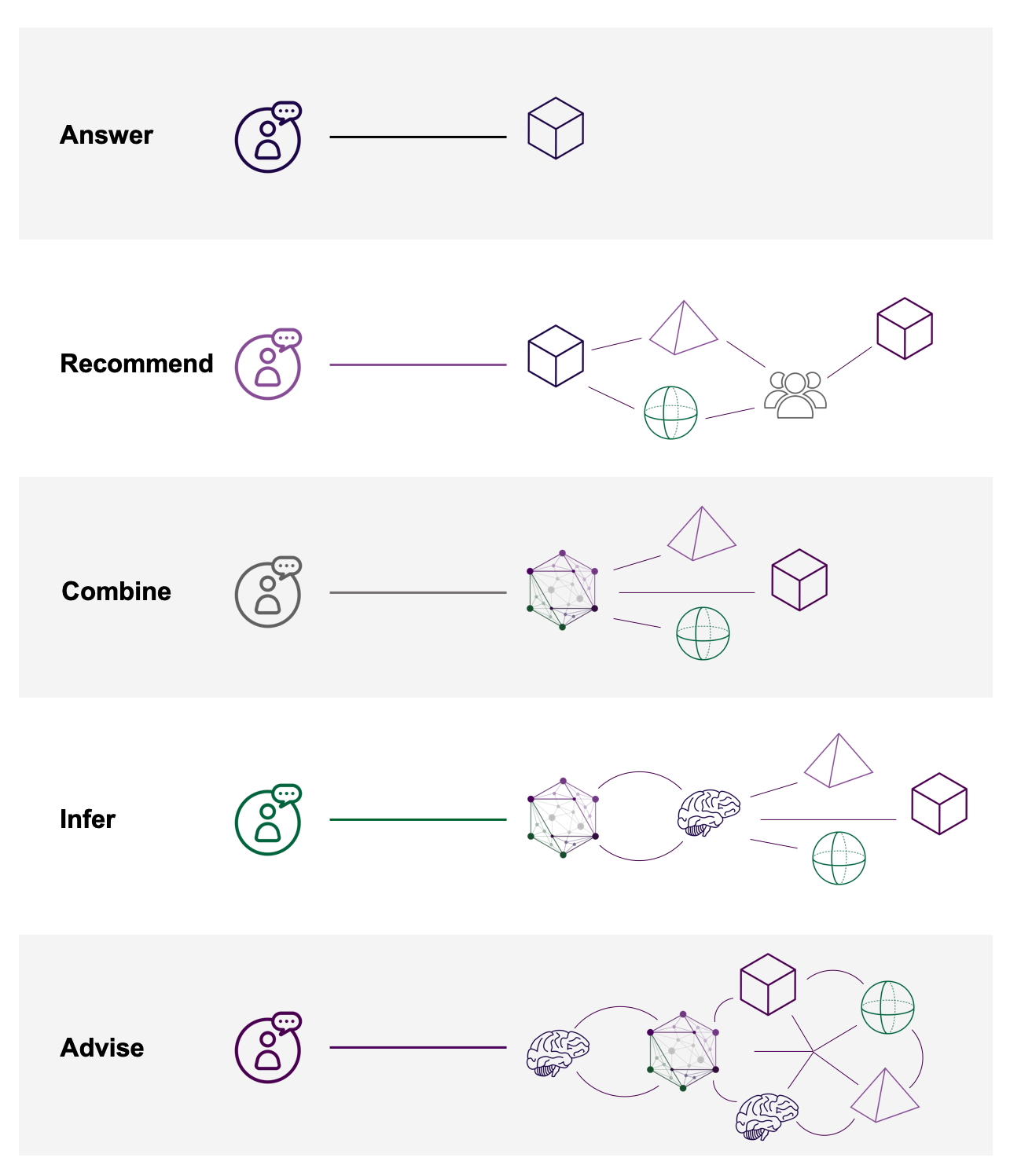 • Combine – Up to this point, the capability levels of Answer and Recommend may be relating content, but each piece of information remains separate. With Combine, Knowledge AI takes a big step to begin automatically integrating different types and sources of content into more cohesive and contextualized blocks of knowledge. Like Recommend, this feature is powered via an ontology, often with a graph database powering it. A common example of this is Google’s Knowledge Panels, which integrate information from multiple sources into an easy to absorb and explore view. We’ve recently helped an international organization achieve these capabilities, better integrating their structured and unstructured information with an understanding of global elements like geography, climate, and geopolitical state. Through this web of content and data, the tool can find themes between countries on different continents, recommending meaningful success stories from areas that share attributes with others despite no obvious link. Another client is using these Combine capabilities to guide the integration of multiple different data sets into a more easily managed ecosystem